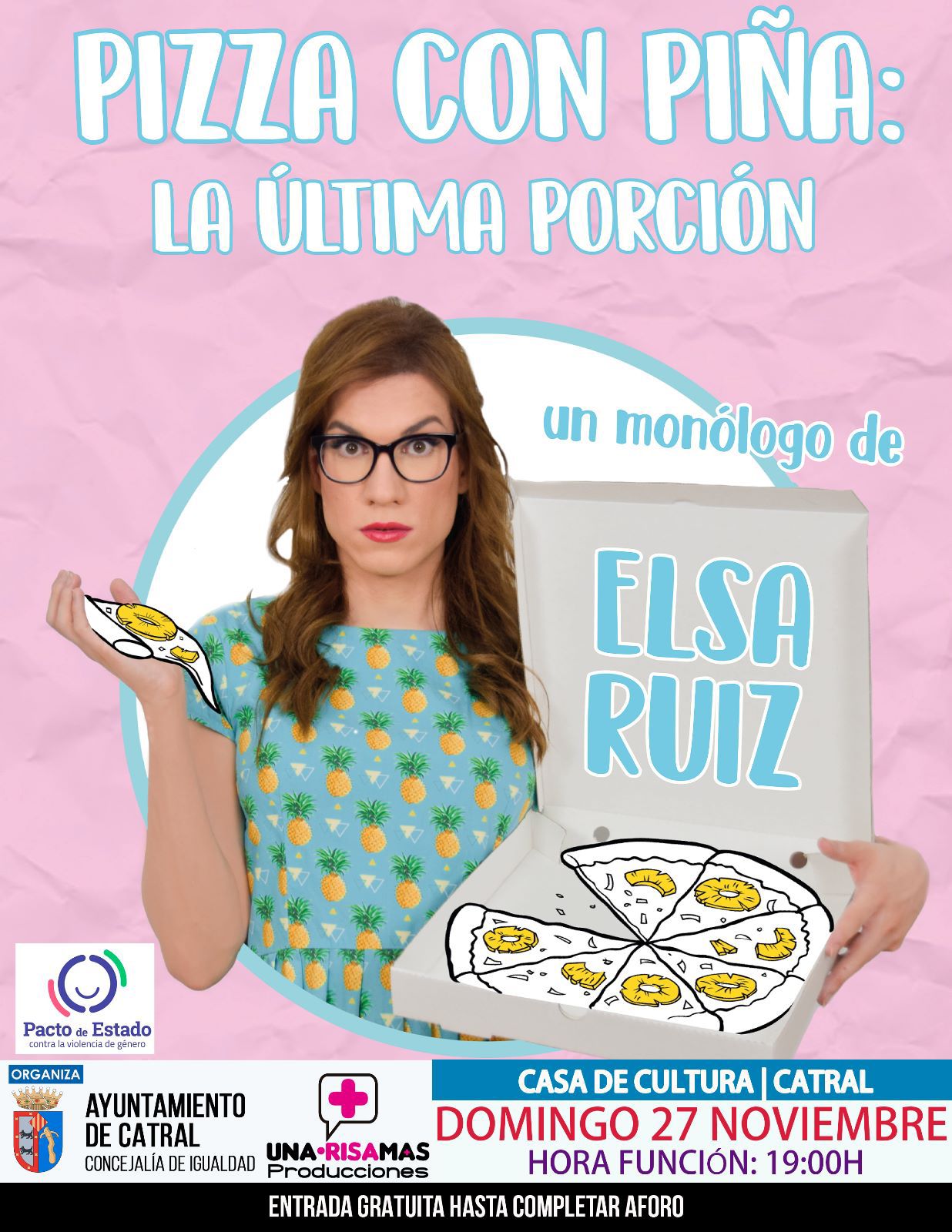Además, domingo 27 a las 19h en la Casa de Cultura disfrutaremos del Monólogo ? de Elsa Ruiz «Pizza con Piña: La última porción». La entrada es gratuita hasta completar aforo (disponibilidad de servicio de ludoteca).