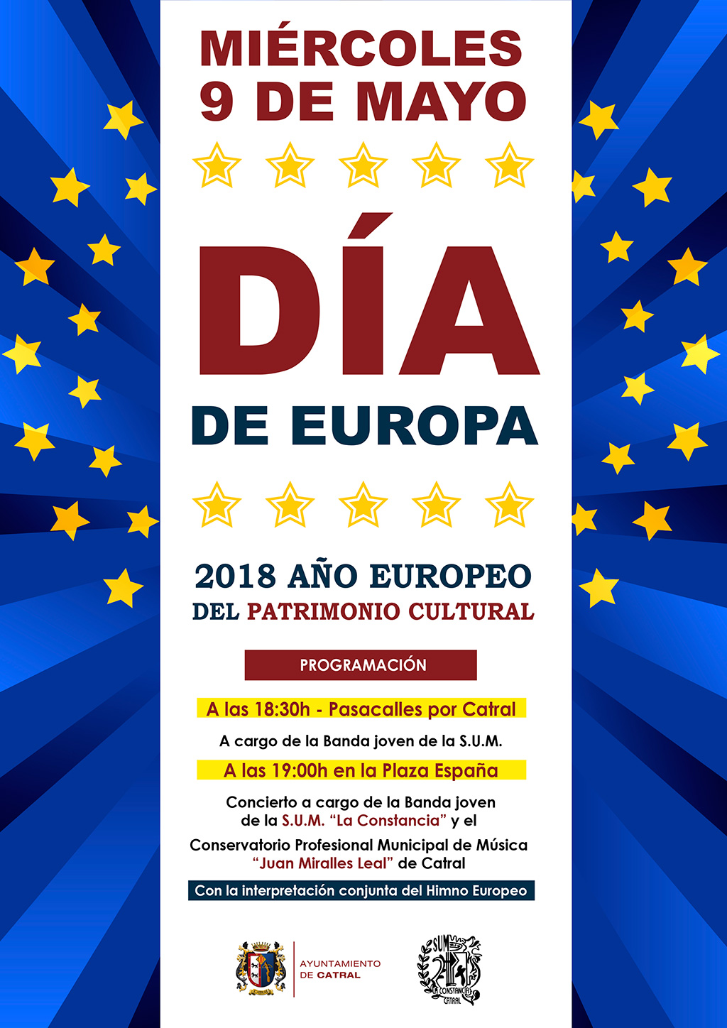 El 2018 es el AÑO CULTURAL EUROPEO y nosotros lo vamos a celebrar con música el próximo MIÉRCOLES 9 DE MAYO. Pasacalles y concierto a cargo de la Banda Joven de la SUM y la interpretación conjunta del Himno Europeo.
