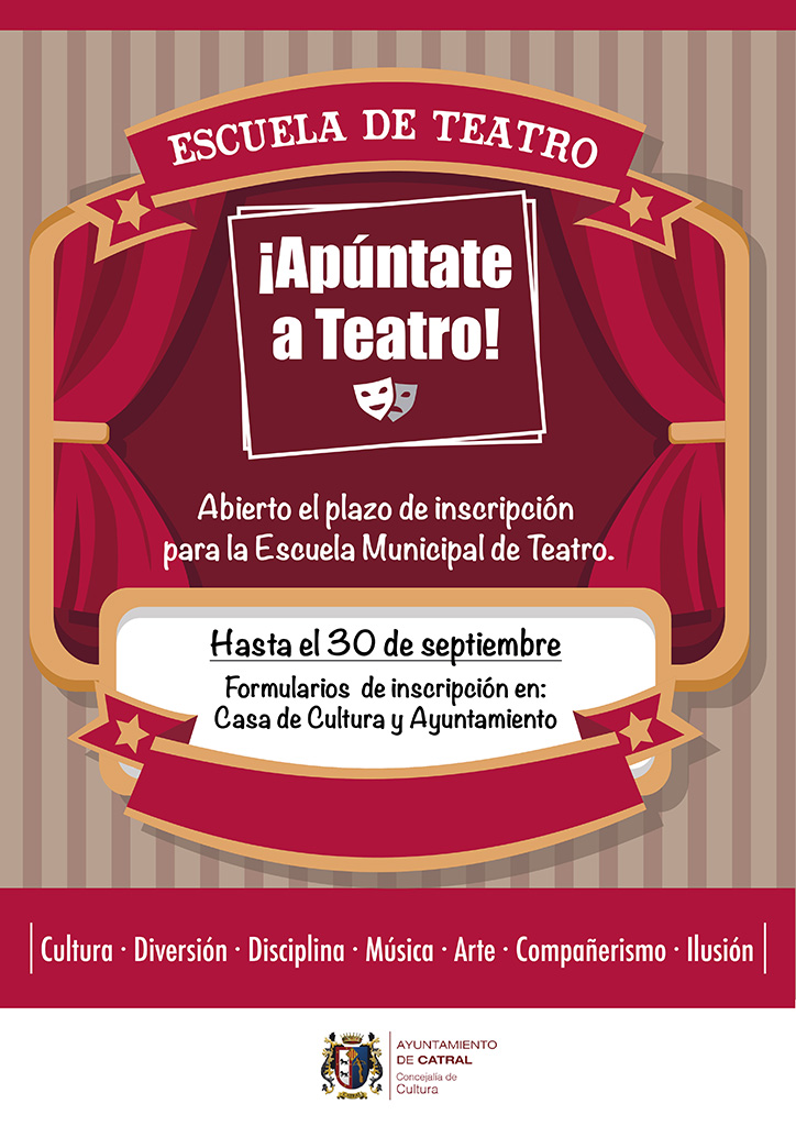 ¡ABIERTO PLAZO DE INSCRIPCIÓN! ¿Te gusta el teatro? La Escuela Municipal de Teatro te está esperando!! Aprenderás disciplina, música, crearás cultura, entretenimiento y diversión. Recoge la inscripción en el Ayuntamiento o en la Casa de Cultura hasta el 30 de septiembre.