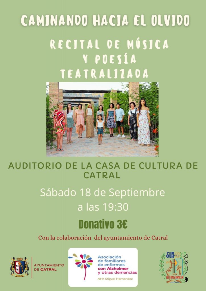 Sábado 18 de Septiembre a las 19:30 horas tienes una cita por una buena causa, ven con nosotros al Recital de Música y Poesía Teatralizada en el auditorio de la Casa de Cultura. Con entrada Donativo para ayudar ante el Alzheimer y otras afecciones.