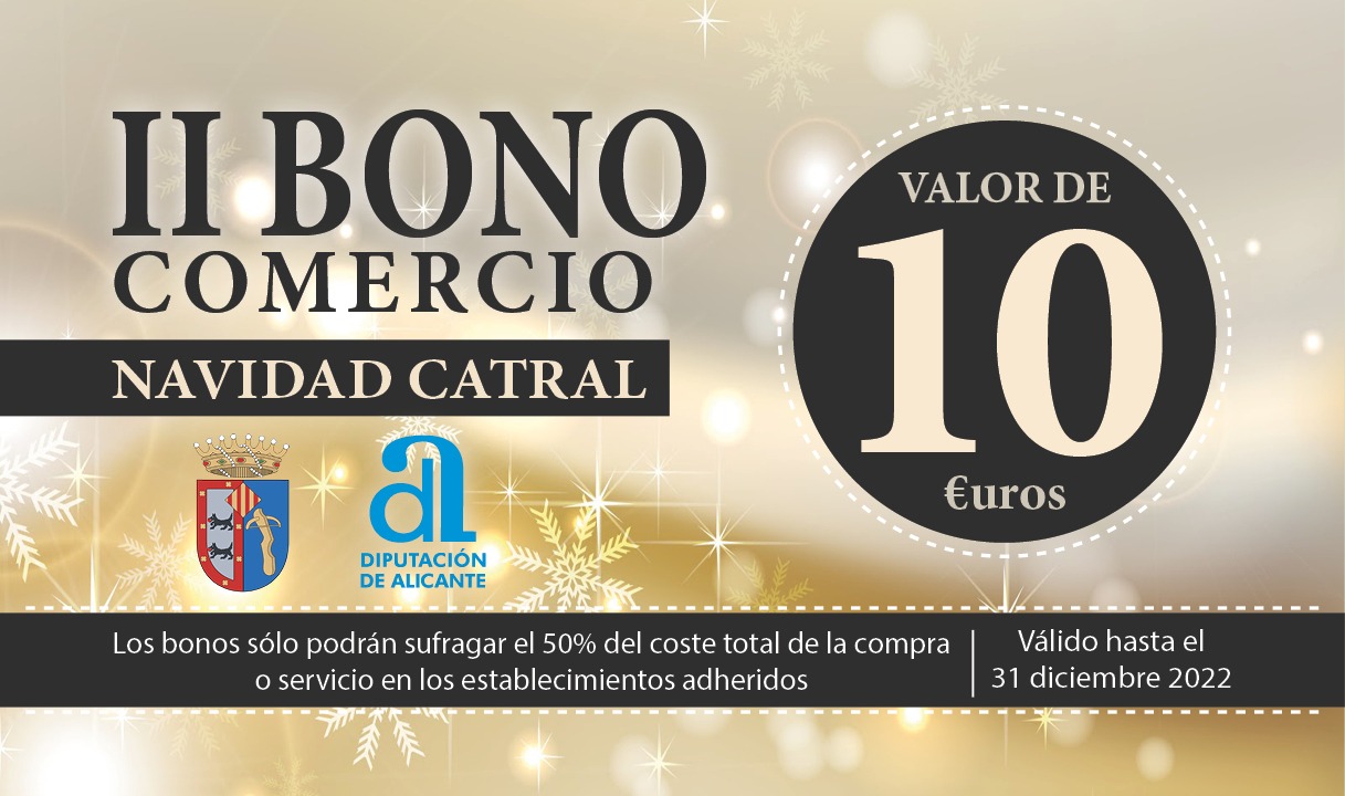 Se trata de una iniciativa de apoyo a la ciudadanía, mayor de 18 años, consistente en la emisión de bonos de consumo que se gestionarán mediante entidades colaboradoras por los establecimientos que se adhieran a la Campaña de II Bonos al Consumo Catral: Navidad 2022, con el objetivo de inyectar liquidez y hacer partícipe a nuestra ciudadanía para beneficiarse de descuentos en su compra o servicio.