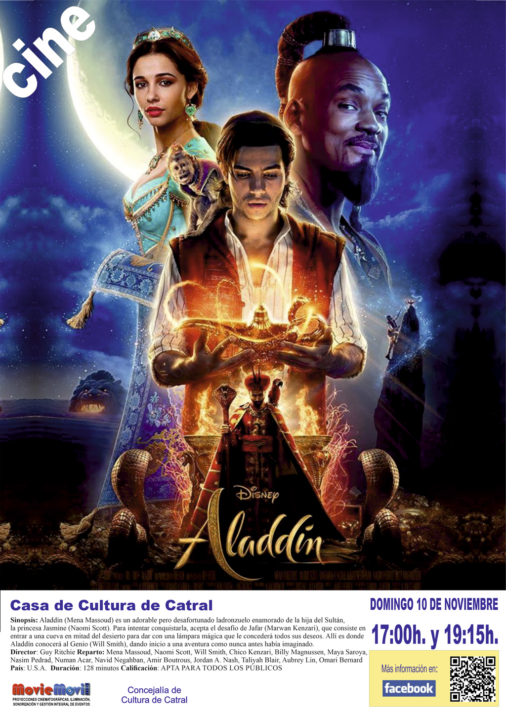 Director: Guy Ritchie. Reparto: mena Massoud, Naomi Scott, Will Smith, Chico Kenzari, Billy Magnussen, Maya Saroya, Nasim Pedrad, Numan Acar, Navid Negahban, Amir Boutrous, Jordan A. Nash, Taliyah Blair, Aubrey Lin, Omari Bernard País: U.S.A Duración: 128 minutos