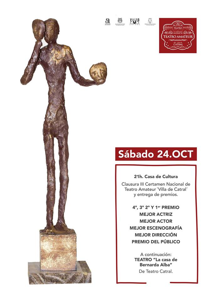 El próximo sábado 24 de octubre se representará La Casa de Bernarda Alba como clausura del III Certamen de Teatro Amateur Villa de Catral con entrega de premios a Mejor Actor, Mejor Actriz, Mejor Dirección y Mejor Escenografía, además del los premios en metálico.