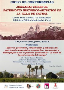 Esta última jornada tendrá lugar en el Centro Socio-Cultural «La Hermandad» situado en la Biblioteca Pública Municipal de Catral. Nos vemos el próximo 2 de junio de 2022 a las 20:00 horas. Una Jornada que trata sobre la protección, conservación y difusión del patrimonio arqueológico, etnográfico, documental y bibliográfico de la exposición permanente «La Villa de Catral a través del tiempo, impartida por Dª Pura Guirau Miralles, Archivera-Bibliotecaria de Catral. Presidenta de la Asociación de Investigadores «Castrum Altum» de Catral