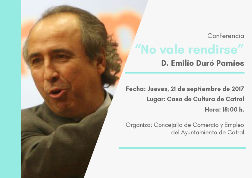 El próximo jueves 21 de septiembre a las 18 horas, tendrá lugar en la Casa de Cultura de Catral la conferencia titulada “No vale rendirse”, a cargo D. Emilio Duró Pamies.