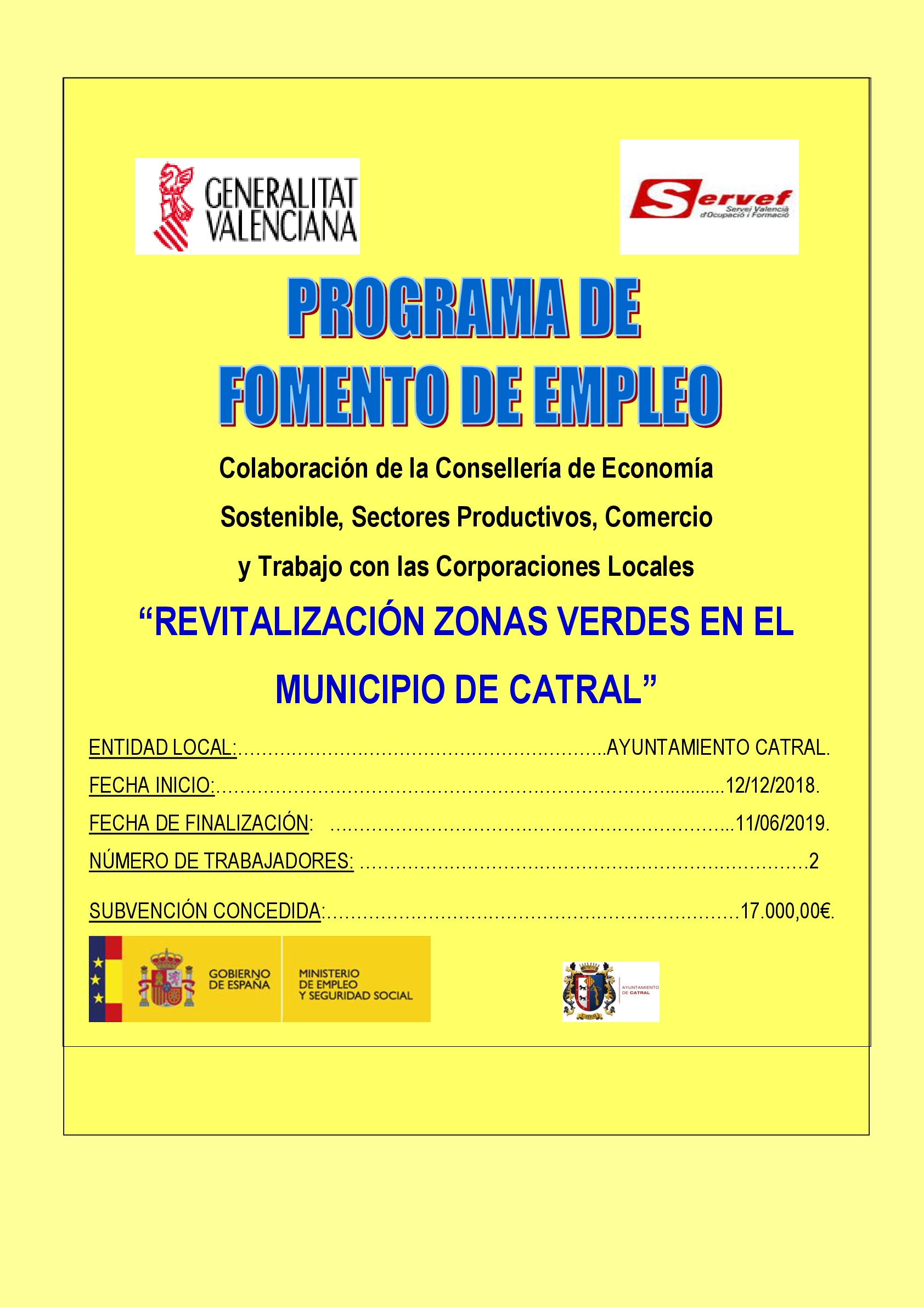 SERVEF dentro del programa de Iniciativa Social EMCORD 2018, concede al AYUNTAMIENTO DE CATRAL una subvención por importe de 17.000,00€ para la contratación de DOS PEONES DE JARDINERÍA para la revitalización de las zonas verdes en el municipio de Catral, durante 6 meses a jornada completa.