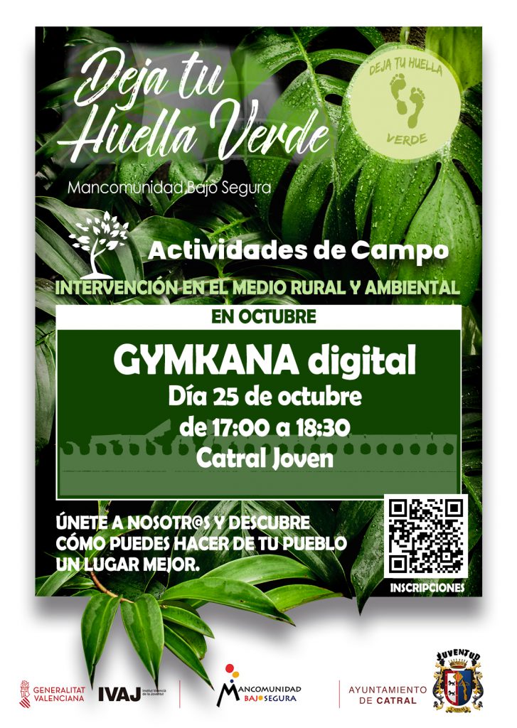 Descubre este domingo 25 de octubre la Gymkana del proyecto “Deja tu huella verde”, de 17:00 a 18:30 nos vemos en Catral Joven. Descubre una nueva manera de realizar Gymkanas, una manera segura y con herramientas digitales, ¡no te olvides tu teléfono móvil, lo necesitarás!