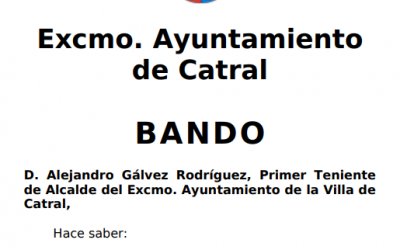 DOÑA MARÍA INMACULADA ÚBEDA PASCUAL, ALCALDESA-PRESIDENTA DEL EXCMO. AYUNTAMIENTO DE CATRAL HACE SABER: Teniendo en cuenta la evolución de la situación sanitaria general causada por el Covid-19 y siguiendo la pauta de las recomendaciones y medidas adoptadas por...