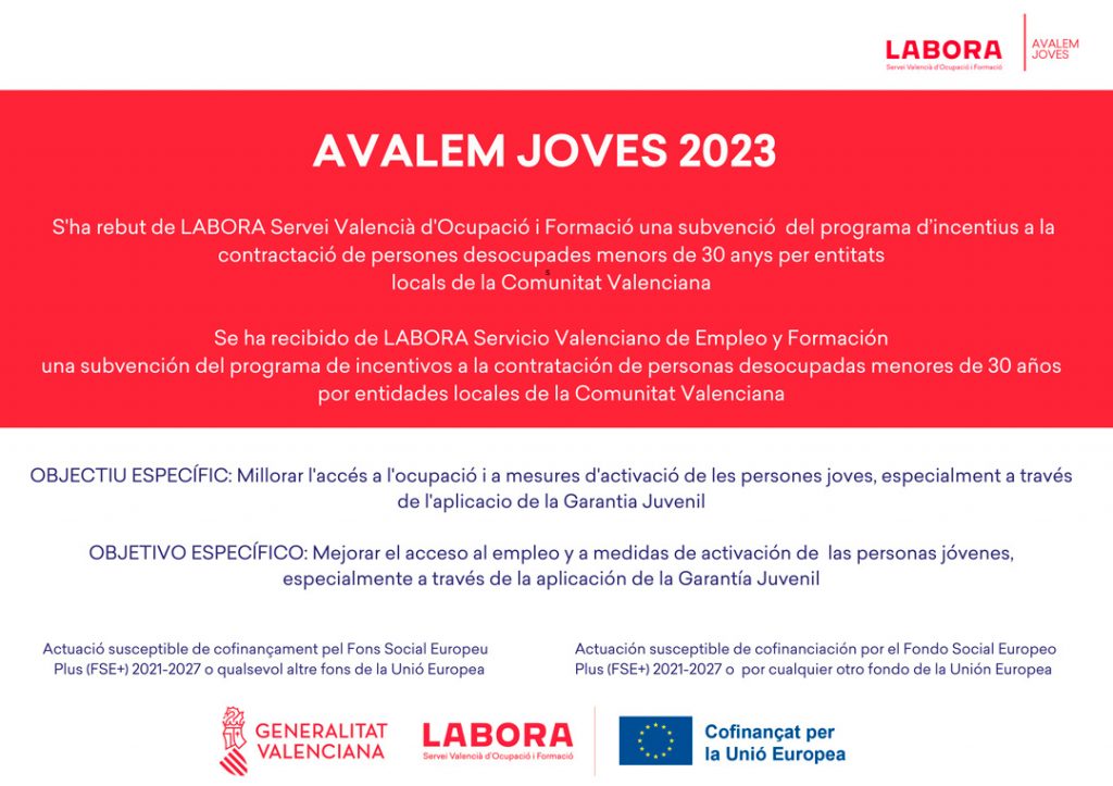 Este proyecto tiene como objeto la concesión de subvenciones para la contratación de personas jóvenes que figuren inscritas en el fichero del sistema nacional de garantía juvenil en el ámbito territorial de la Comunidad Valenciana para este año 2023. La subvención recibida del fondo social europeo es de 55.419,81€.