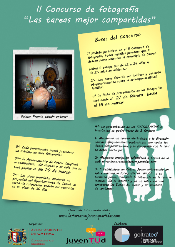 Desde las Concejalías de Igualdad y Juventud del Ayuntamiento de Catral, se convoca la 2ª Edición del concurso de fotografía “Las tareas mejor compartidas”.