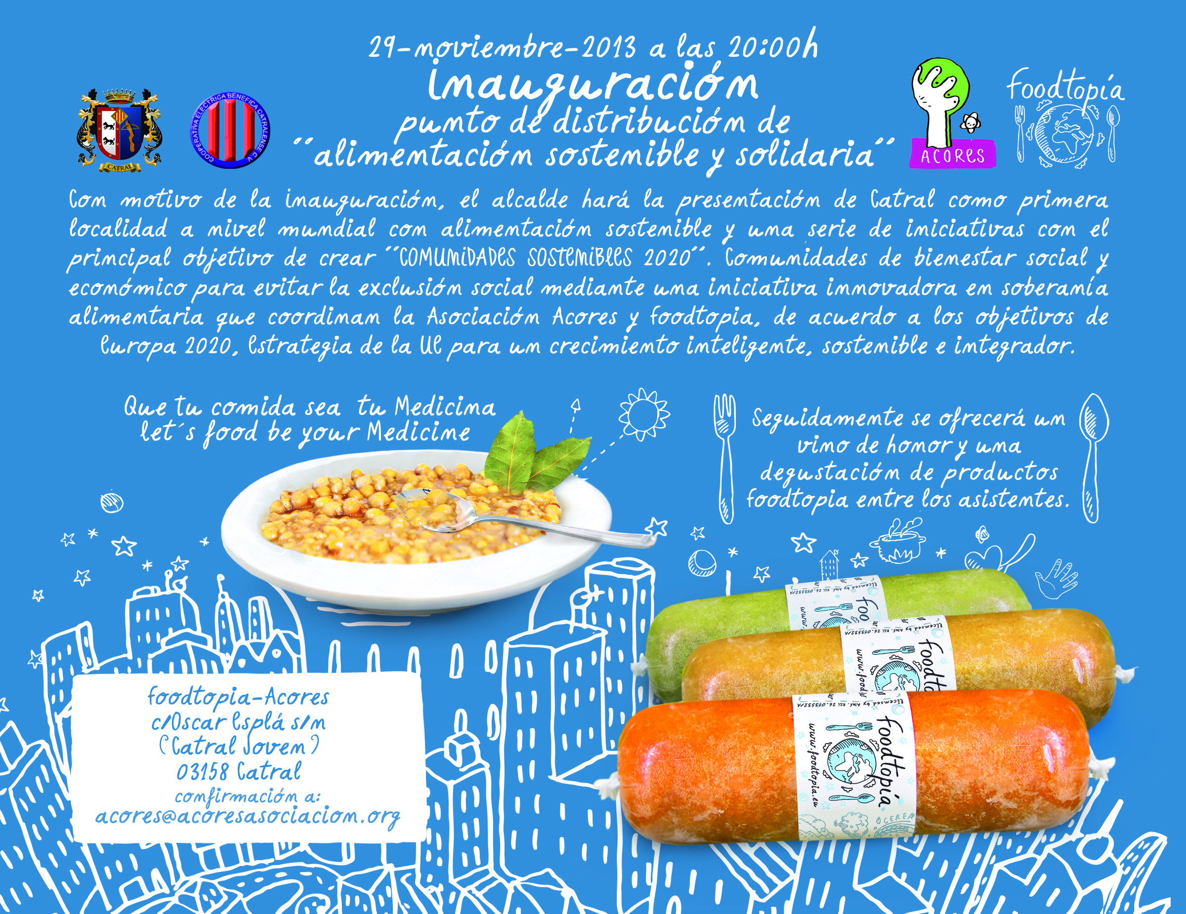 Con motivo de la inauguración, el alcalde hará la presentación de Catral como primera localidad a nivel mundial con alimentación sostenible y una serie de iniciativas con el principal objetivo de crear «COMUNIDADES SOSTENIBLES 2020». Comunidades de bienestar social y económico para evitar la exclusión social mediante una iniciativa innovadora en soberanía alimentaria que coordinan la Asociación Acores y Foodtopia, de acuerdo a los objetivos de europa 2020, estrategia de la UE para un crecimiento inteligente, sostenible e integrador.