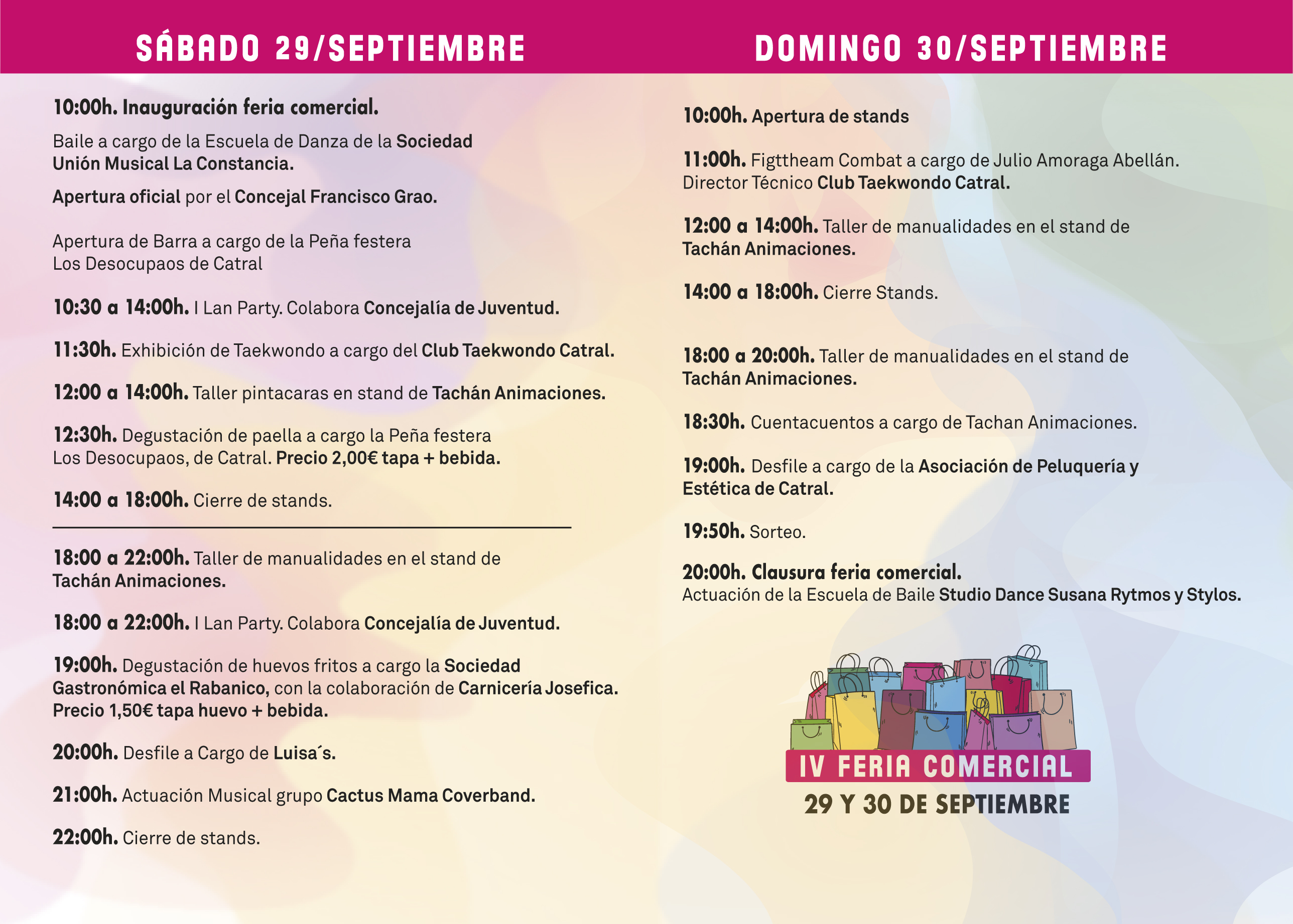 La IV Feria del Comercio de Catral, comprende los días 29 y 30 de Septiembre acogiendo a los comercios minoristas del municipio, de los diferentes sectores de actividad que conforman el tejido comercial de Catral, propiciando a: