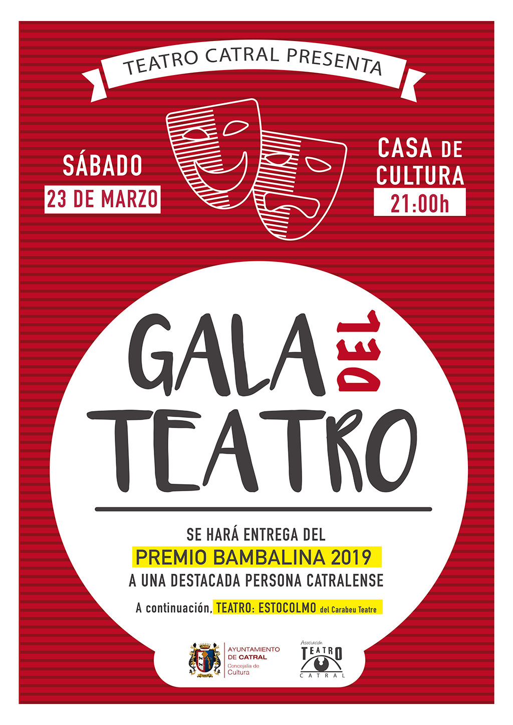 El auditorio de la Casa de Cultura de Catral acogerá el próximo sábado 23 de marzo (21:00 horas) la Gala del Teatro, en conmemoración del Día Mundial del Teatro, donde se galardonará con el Premio Bambalina 2019 a una destacada persona catralense.