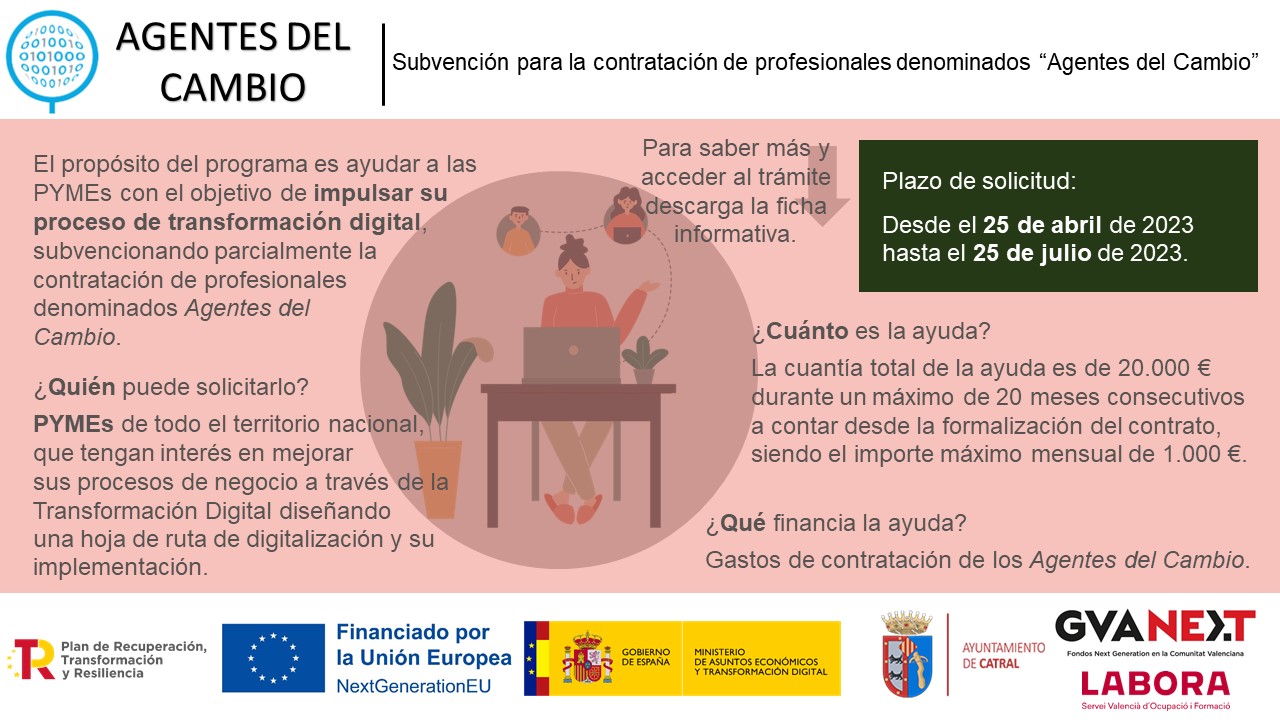 El propósito del programa es ayudar a las PYMEs con el objetivo de impulsar su proceso de transformación digital, subvencionando parcialmente la contratación de profesionales denominados “Agentes del Cambio”. La cuantía total de la ayuda es de 20.000 € durante un máximo de 20 meses consecutivos a contar desde la formalización del contrato, siendo el importe máximo mensual de 1.000 €.