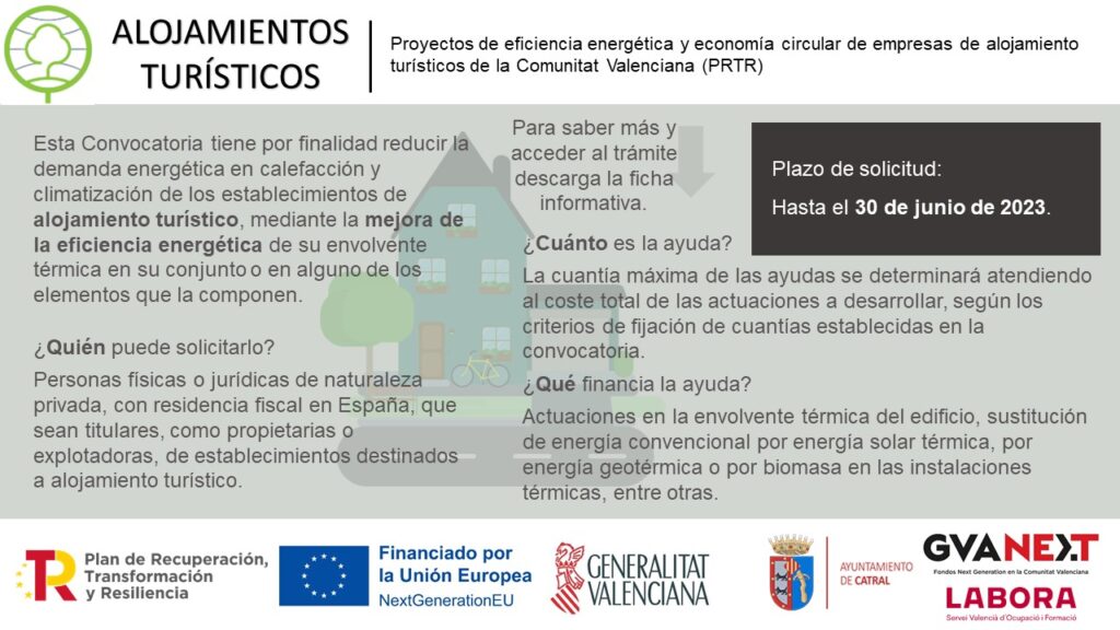 Esta convocatoria para proyectos de eficiencia energética y economía circular de empresas de alojamiento turísticos de la Comunitat Valenciana tiene por finalidad reducir la demanda energética en calefacción y climatización de los establecimientos de alojamiento turístico, mediante la mejora de la eficiencia energética de su envolvente térmica en su conjunto o en alguno de los elementos que la componen.