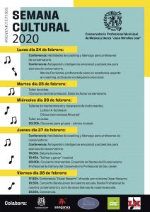 Programación de la semana cultural organizada por el Conservatorio Profesional Municipal de Música y Danza «Juan Miralles Leal», llena de conferencias, talleres y otras actividades.