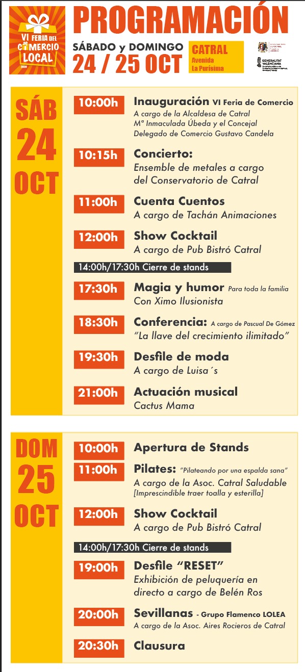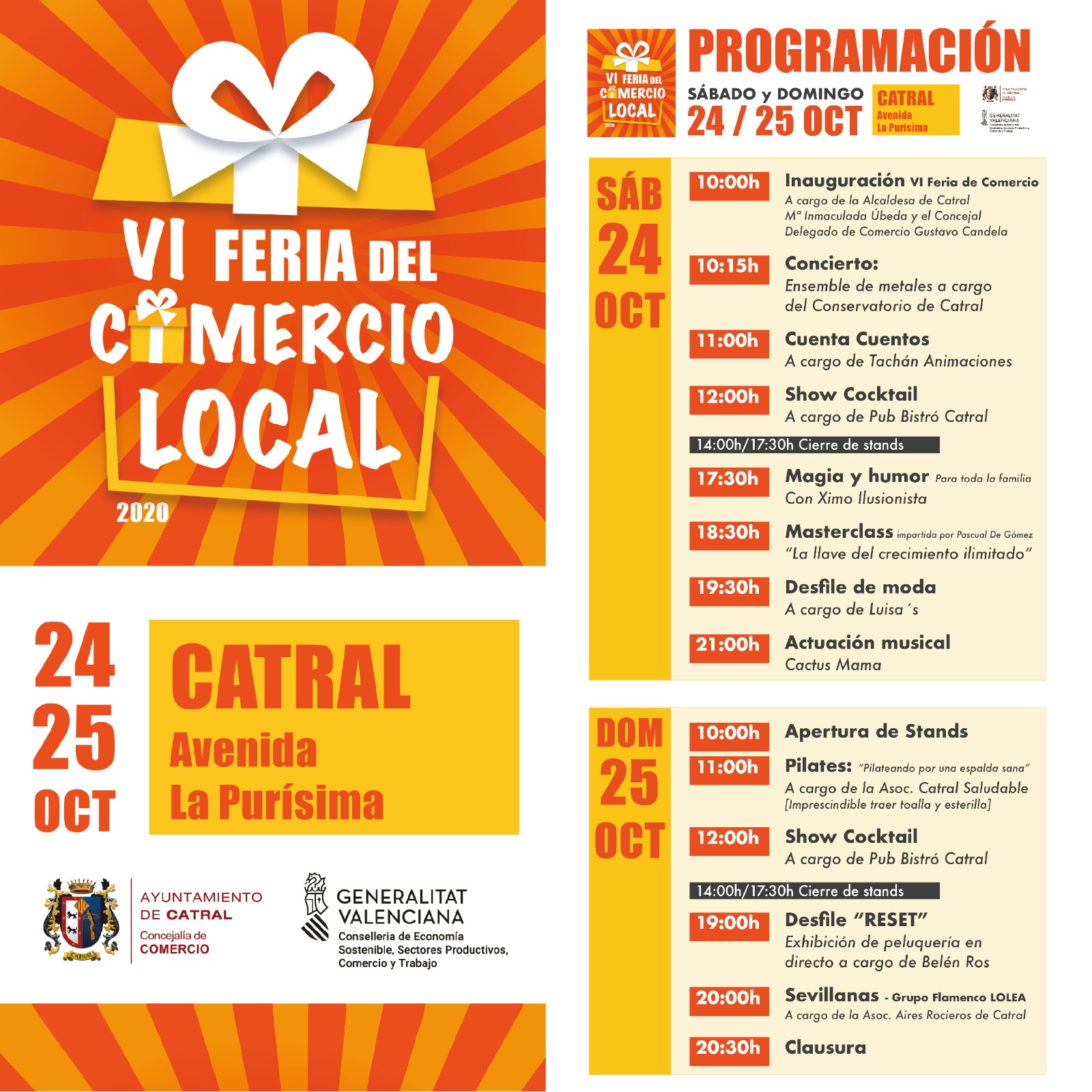 Durante el Sábado 24 y Domingo 25 de Octubre se celebra la feria comercial de Catral. Tendrá lugar en la Avenida Purísima donde además de los stands se podrá disfrutar de talleres, desfiles, conciertos, etc…